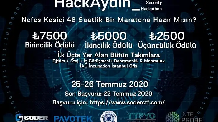 İstanbul Aydın Üniversitesi ev sahipliği, Intelprobe ve Pavotek firmalarının sponsorluğunda gerçekleştirilecek etkinliğe son başvuru, 23 Temmuz tarihine kadar www.soderctf.com adresinden gerçekleştirilebilecek.
