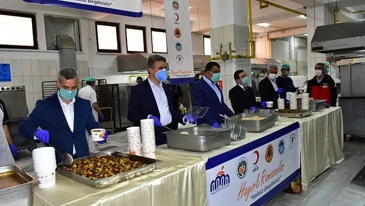 Vali Baruş ve beraberindekiler sosyal mesafe kuralına uyarak, Ramazan ayının ilk günü iftarda Malatya’da evlere ulaşacak yemekleri kaplara doldurdular.