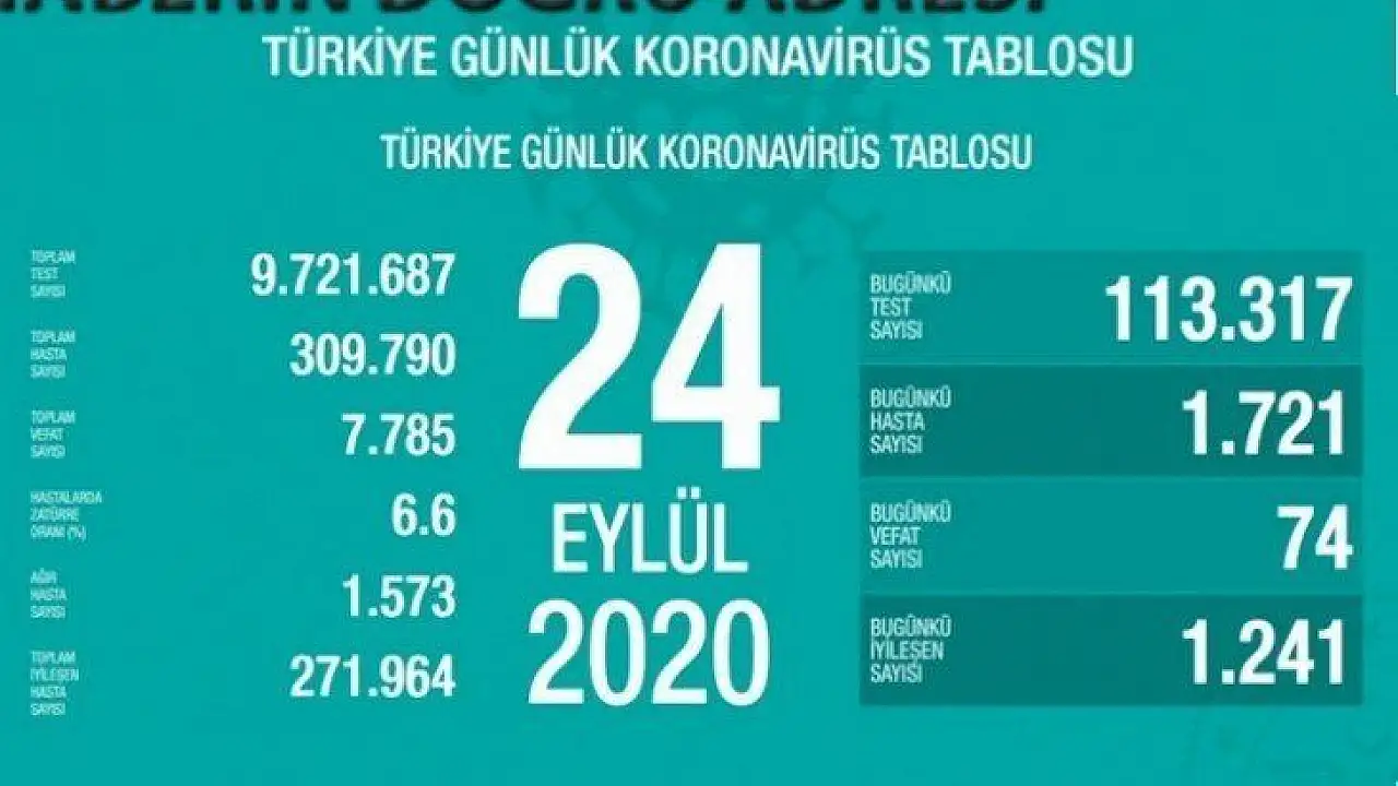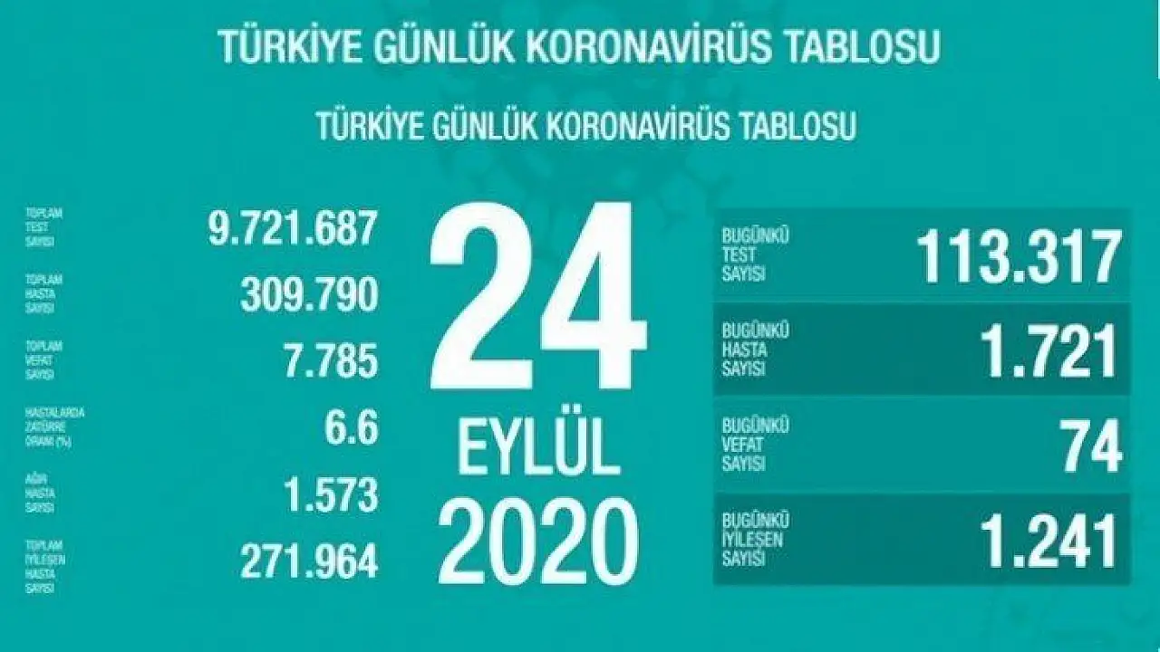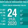 Sağlık Bakanlığı tarafından 24 Eylül koronavirüs tablosu, hasta, test, vefat sayısı ve son durum açıklandı. Türkiye’de son 24 saatte 113 bin 317 Kovid-19 testi yapıldı, 1721 kişiye hastalık tanısı konuldu. Son 24 saatte 74 kişi Kovid-19 nedeniyle hayatını kaybetti, ağır hasta sayısı 1573 oldu.