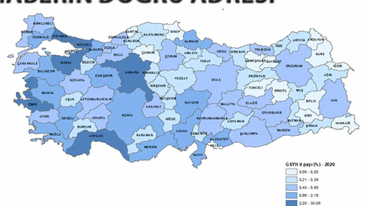 İl düzeyinde cari fiyatlarla GSYH hesaplamalarına göre; 2020 yılında İstanbul 1 trilyon 517 milyar 324 milyon TL ile en yüksek GSYH'ye ulaştı ve toplam GSYH'den %30,1 pay aldı. İstanbul'u, 482 milyar 589 milyon TL ve %9,6 pay ile Ankara, 306 milyar 713 milyon TL ve %6,1 pay ile İzmir izledi. İl düzeyinde GSYH hesaplarında son üç sırada 5 milyar 65 milyon TL ile Tunceli, 4 milyar 487 milyon TL ile Ardahan ve 3 milyar 191 milyon TL ile Bayburt yer aldı.