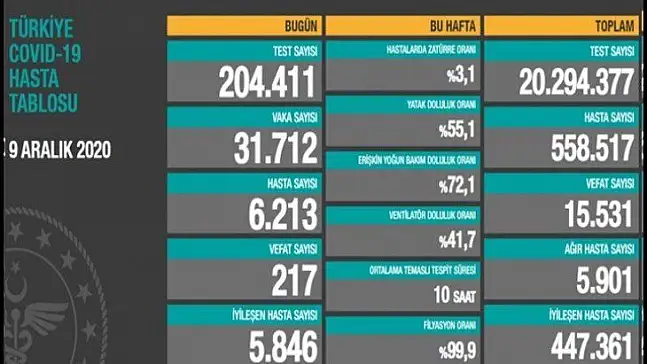 Sağlık Bakanlığı tarafından 9 Aralık koronavirüs tablosu, vaka, hasta, test, vefat sayısı ve son durum açıklandı. Türkiye'de son 24 saatte 204 bin 411 Kovid-19 testi yapıldı, 31 bin 712 kişinin testi pozitif çıktı, 217 kişi hayatını kaybetti. Ağır hasta sayısı 5 bin 901 oldu, son 24 saatte 5 bin 846 kişinin Kovid-19 tedavisinin tamamlanmasıyla iyileşenlerin sayısı 447 bin 361'e yükseldi.