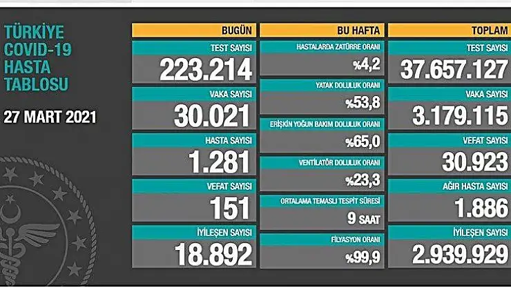 Bugünkü verilerle toplam test sayısı 37 milyon 657 bin 127, toplam vaka sayısı 3 milyon 179 bin 115, toplam vefat sayısı 30 bin 923, toplam ağır hasta sayısı1886, toplam iyileşen sayısı ise 2 milyon 939 bin 929 oldu.