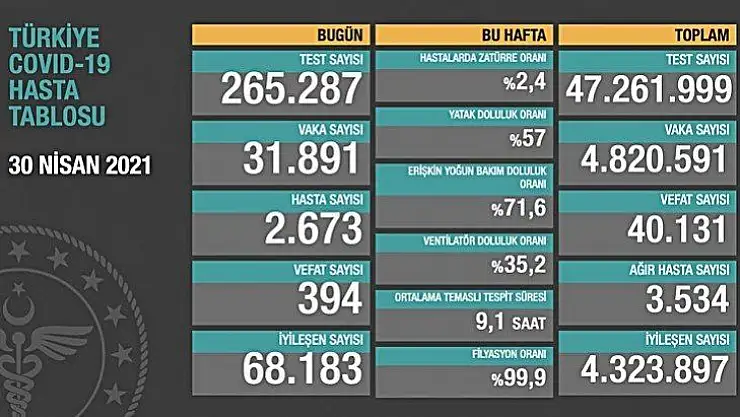 Türkiye'de son 24 saatte 265 bin 287 Kovid-19 testi yapıldı, 31 bin 891 kişinin testi pozitif çıktı, 394 kişi hayatını kaybetti.
