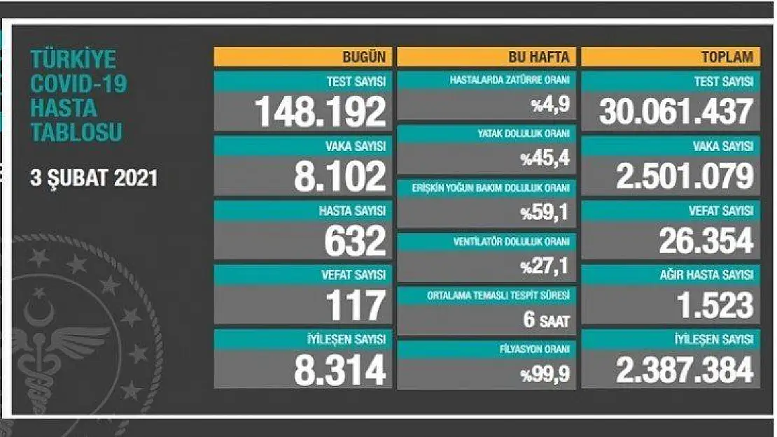 Sağlık Bakanlığı tarafından 3 Şubat koronavirüs tablosu, vaka, hasta, test, vefat sayısı ve son durum açıklandı. Türkiye'de son 24 saatte 148 bin 192 Kovid-19 testi yapıldı, 8 bin 102 kişinin testi pozitif çıktı, 117 kişi hayatını kaybetti. Ağır hasta sayısı 1523 oldu, 8 bin 314 kişinin Kovid-19 tedavisinin/karantinasının sona ermesiyle iyileşen sayısı 2 milyon 387 bin 384'e yükseldi.