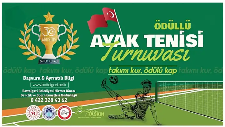Battalgazi Belediyesi Gençlik ve Spor Hizmetleri Müdürlüğü tarafından Ayak Tenisi Turnuvası düzenleniyor. 30 Ağustos Zafer Bayramında final maçı oynanacak turnuvaya son başvuru tarihi 22 Ağustos.