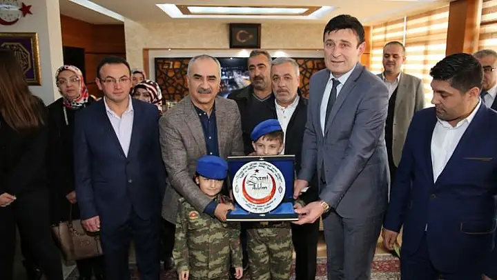Yiyecek Yapanlar ve Satanlar Odası Başkanı Akgül ile yönetiminden oluşan heyet ile yine Başkan Aydın'dan esprili bir dille Etli Ekmek isteyen öğrenciler Belediye Başkanı Sami Aydın'ı makamında ziyaret etti.
