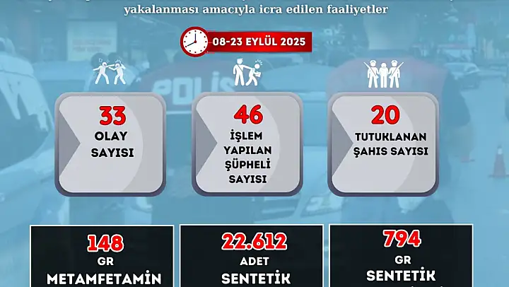 Operasyonlarda 148 gram metamfetamin, 22 bin 612 adet sentetik ecza, 794 gram sentetik kannabinoid, 15 bin 600 gram esrar, 115 kök kenevir ve 48 gram sentetik kannabinoid hammaddesi ele geçirildi.