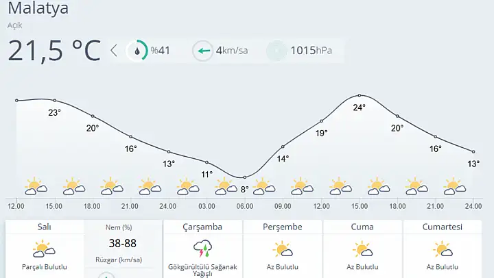 MALATYA (MHA) - Malatya'da hafta başı itibariyle açık ve parçalı bulutlu bir hava etkili olurken, çarşamba günü gök gürültülü sağanak yağış bekleniyor.