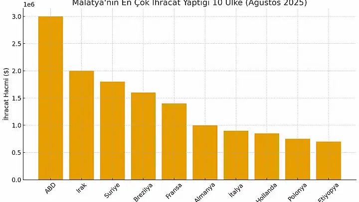 Malatya'nın Ağustos 2025 ihracatında ABD açık ara lider olurken, Irak ve Suriye bölgesel pazarda öne çıktı.