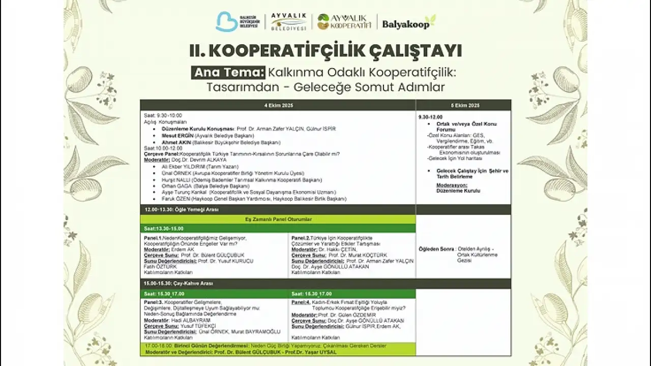 Türkiye Kooperatifçiler Platformu tarafından düzenlenen 3. Kooperatifçilik Çalıştayı, 4-6 Ekim 2025 tarihlerinde Balıkesir'in Ayvalık ilçesinde gerçekleştirilecek