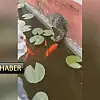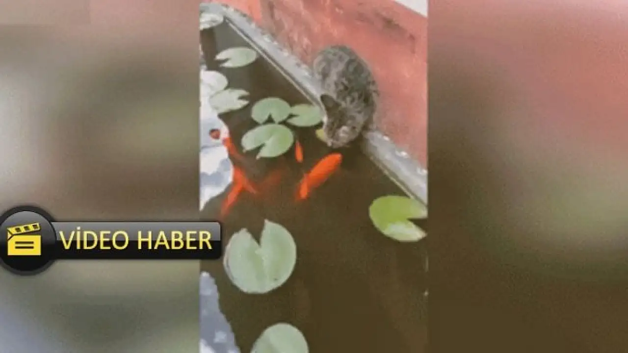 Küçük havuzun başında duran kediyi, suyun içerisindeki balık öpüyor. O ilginç anlar kameraya böyle yansıdı.