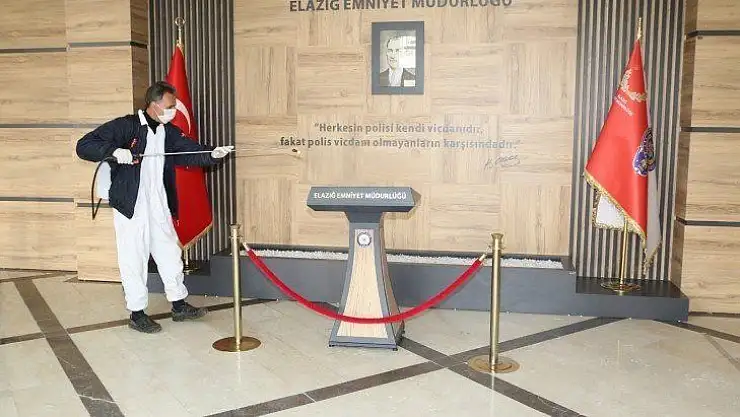 Elazığ Belediyesi ekipleri toplu kullanım alanlarında 7/24 kesintisiz sürdürdüğü dezenfeksiyon çalışmalarına ek olarak Emniyet Müdürlüğü, Elazığ Adliyesi, 8. Kolordu Komutanlığı başta olmak üzere kurum ve kuruluşlarda da dezenfeksiyon sağlıyor.