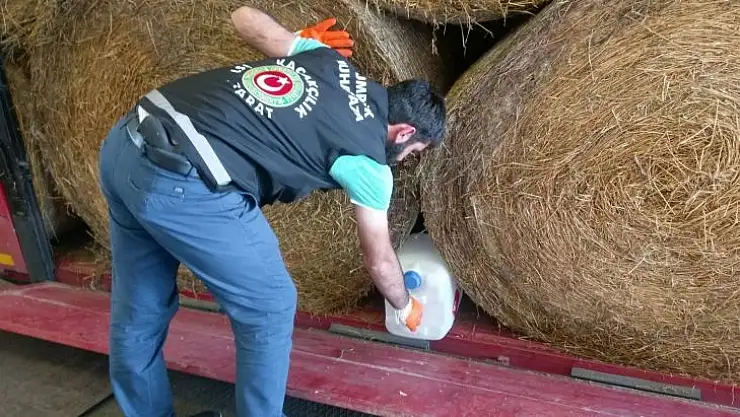 Muhafaza memurları refakatinde gerekli güvenlik önlemleri alındıktan sonra arama hangarına yönlendirilen TIR’da yapılan ön kontrolde gümrük mührünün sağlam olduğu ancak mühür sökülüp dorse açıldığında, dorse kapağı ile yük arasında kalan boşlukta ve yonca balyalarının arasındaki boşluklarda bidonlar olduğu belirlendi.