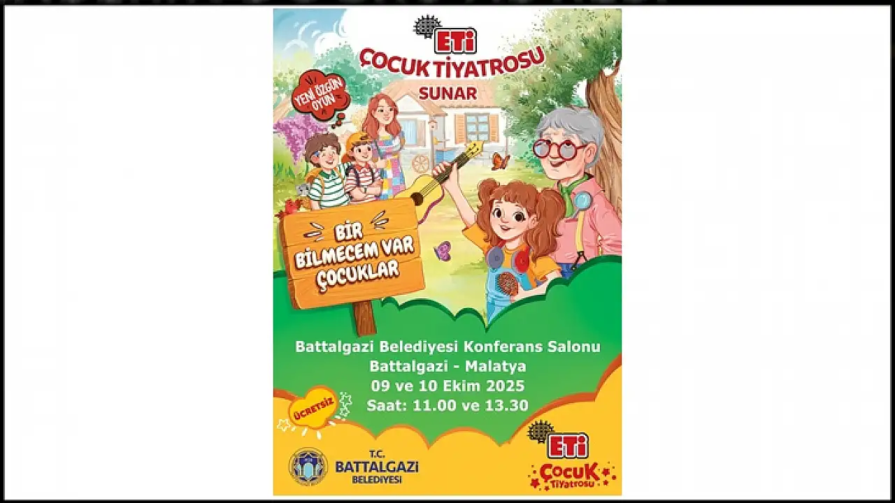 “Eti Çocuk Tiyatrosu” Battalgazi Belediyesi Kent Tarih ve Tanıtım Müdürlüğü organizesinde 9 Ekim Perşembe ve 10 Ekim Cuma günü çocuklarla buluşacak. 2 gün 11.00 ve 13.30 saatlerinde Battalgazi Belediyesi Konferans Salonu'nda sahne alacak tiyatro tamamen ücretsiz olacak.