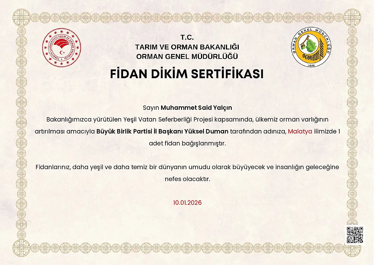 Bu çalışmayla Malatya’ya küçük ama değerli bir katkı sunmayı hedeflediklerini vurgulayan BBP İl Başkanlığı, “Yeşil Malatya” hedefi doğrultusunda doğaya nefes olmayı amaçladıklarını kaydetti. Açıklamada, “Unutmayalım ki; fidanlar büyür, ağaç olur; ağaçlar çoğalır, orman olur. Bugün yapılan küçük bir bağış, yarın büyük bir çevre kazanımına dönüşür” ifadelerine yer verildi.