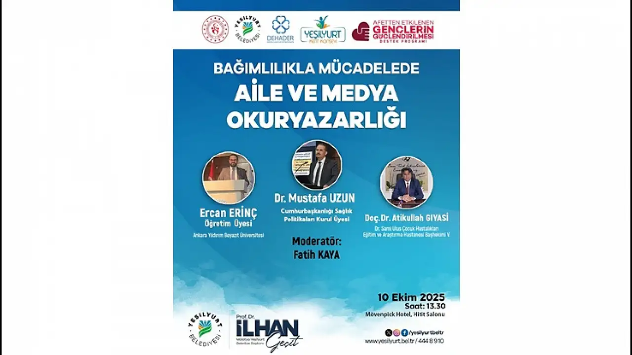 Yeşilyurt Belediyesi ve Yeşilyurt Kent Konseyi, gençlerin kişisel gelişimine katkı sunmak ve toplumsal farkındalık oluşturmak amacıyla 10 Ekim Cuma günü saat 13:30’da “Bağımlılıkla Mücadelede Aile ve Medya Okuryazarlığı” paneli düzenleyecek. Panele, Cumhurbaşkanlığı Sağlık Politikaları Kurul Üyesi Dr. Mustafa Uzun başta olmak üzere alanında deneyimli isimler katılacak.