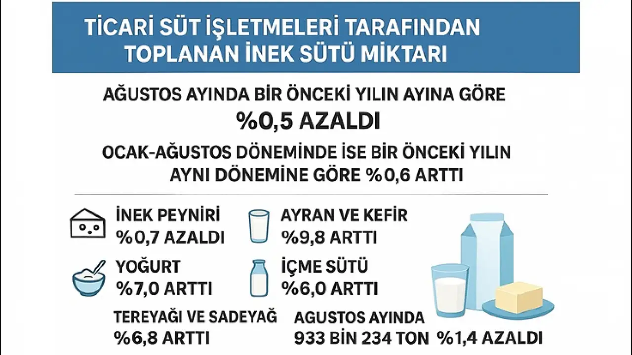 Ticari süt işletmeleri tarafından toplanan inek sütü miktarı, Ağustos ayında bir önceki yılın aynı ayına göre %0,5 azaldı, Ocak-Ağustos döneminde ise bir önceki yılın aynı dönemine göre %0,6 arttı.