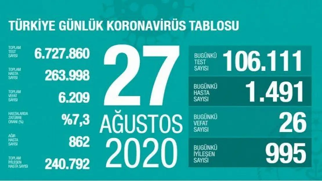 Sağlık Bakanlığı tarafından 27 Ağustos koronavirüs tablosu, vaka, test, vefat sayısı ve son durum açıklandı. Türkiye'de son 24 saatte 1491 kişiye Kovid-19 tanısı konuldu, 26 kişi hayatını kaybetti, toplam vaka sayısı 263 bin 998, can kaybı 6 bin 209 oldu.