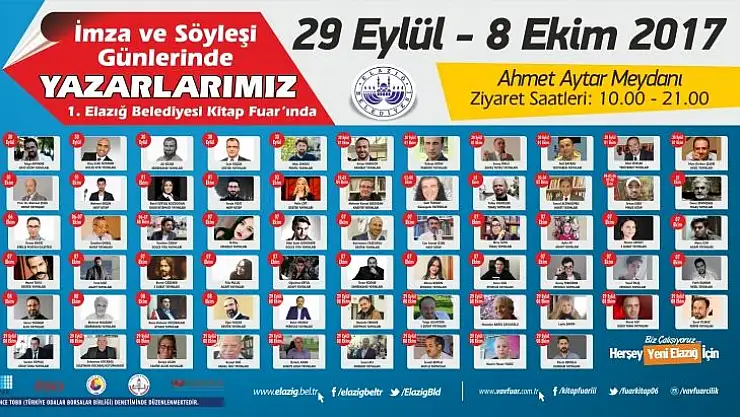 Elazığ Belediyesi 1. Kitap Fuarı ünlü yazarların akınına uğrayacak. Kamuoyunun yakından tanıdığı isimler kitap fuarında söyleşi ve imza günlerine katılarak kitapseverlerle bir arada olacak. Mete Yarar, Mustafa Armağan, Talha Uğurluel, Pelin Çift, Prof. Dr. Mehmet Çelik, Betül Soysal Bozdoğan, Sinan Yağmur gibi ünlü isimler, hem kitap imza gününe katılacak hem de güncel konularla ilgili söyleşiler gerçekleştirecek.