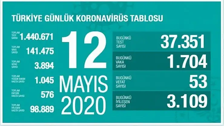 Sağlık Bakanlığı tarafından 12 Mayıs koronavirüs tablosu, vaka, test sayısı ve son durum açıklandı. Türkiye'de son 24 saatte 1704 kişiye Kovid-19 tanısı kondu, 53 kişi hayatını kaybetti, toplam vaka sayısı 141 bin 475, can kaybı 3 bin 894 oldu. Bakan Koca, toplam vakaların yüzde 70'nin iyileştiğini açıkladı.