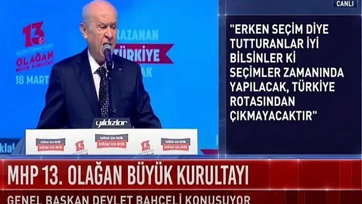 MHP 13. Olağan Büyük Kurultayı, Ankara Spor Salonu'nda yapılıyor. Kurultayda konuşan MHP Genel Başkanı Devlet Bahçeli, CHP, İP ve HDP'ye yüklendi. HDP'ye açılan kapatma davasına değinen Bahçeli "HDP'nin açılmamak üzere kapatılması tarihe borcumuzdur, savcının kapatılma talebi yüreğimize su serpmiştir. HDP başka bir isimle de açılmamak üzere kapatılmalıdır" dedi