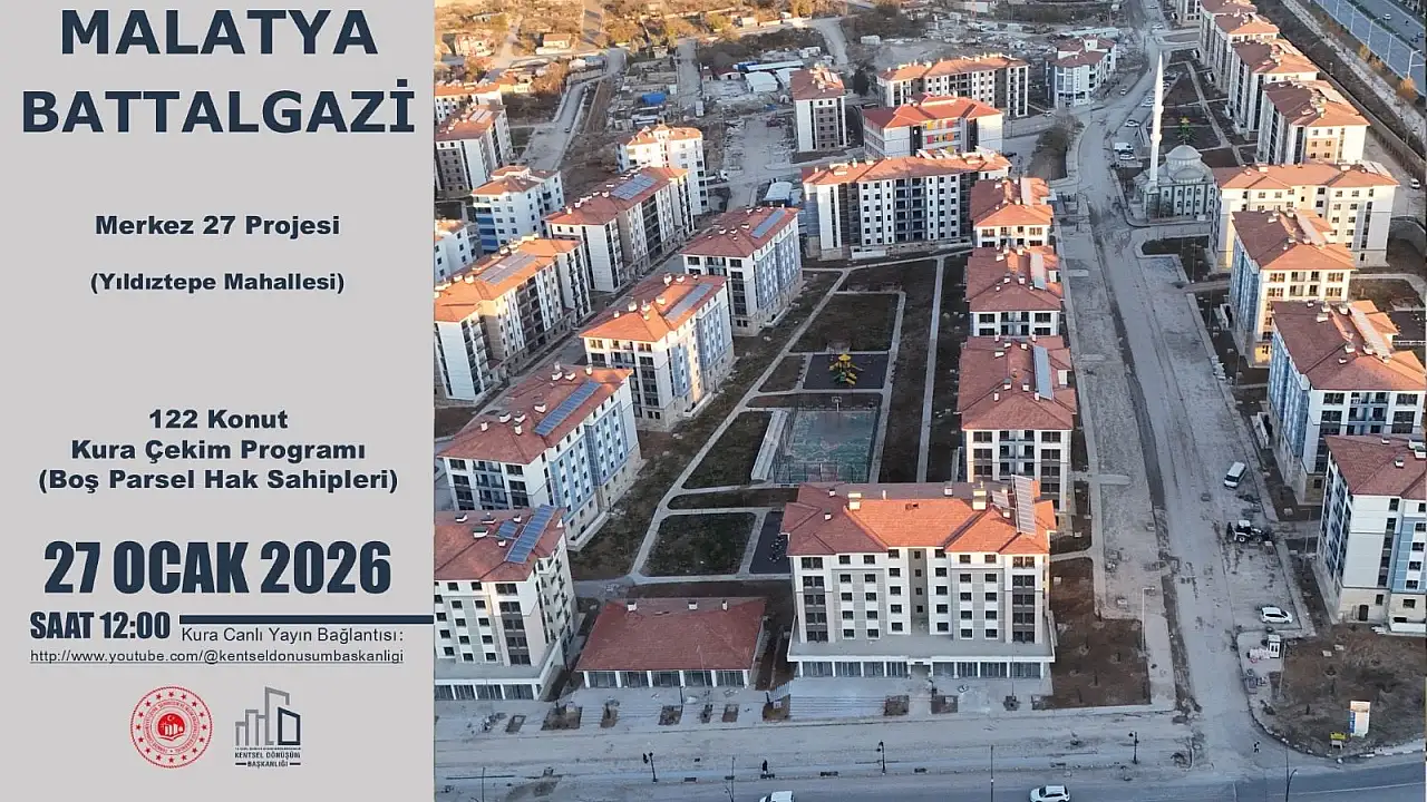 Merkez 32 ve Merkez 27 projeleri kapsamında Yeşilyurt ve Battalgazi ilçelerinde inşa edilen toplam 187 konutun kura çekimi, 27 Ocak Salı günü noter huzurunda yapılacak ve YouTube üzerinden canlı yayınlanacak.