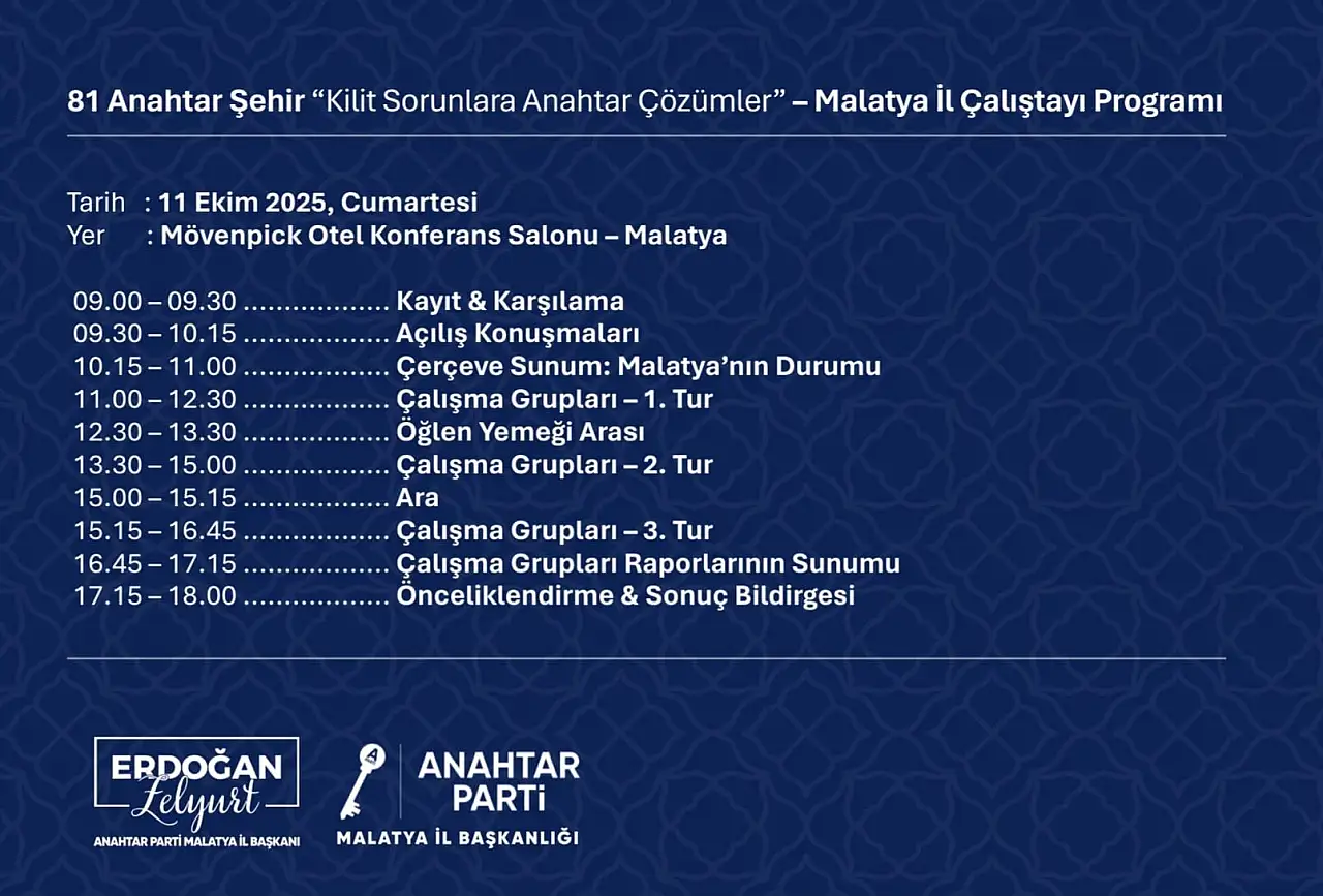 Anahtar Partisi Malatya İl Başkanlığı, “81 Anahtar Şehir: Kilit Sorunlara Anahtar Çözümler” projesi kapsamında önemli bir çalıştaya ev sahipliği yapıyor. 11 Ekim 2025 Cumartesi günü Mövenpick Otel Konferans Salonu’nda gerçekleştirilecek olan Malatya İl Çalıştayı’nda, şehrin temel sorunları tüm paydaşlarla birlikte masaya yatırılacak.