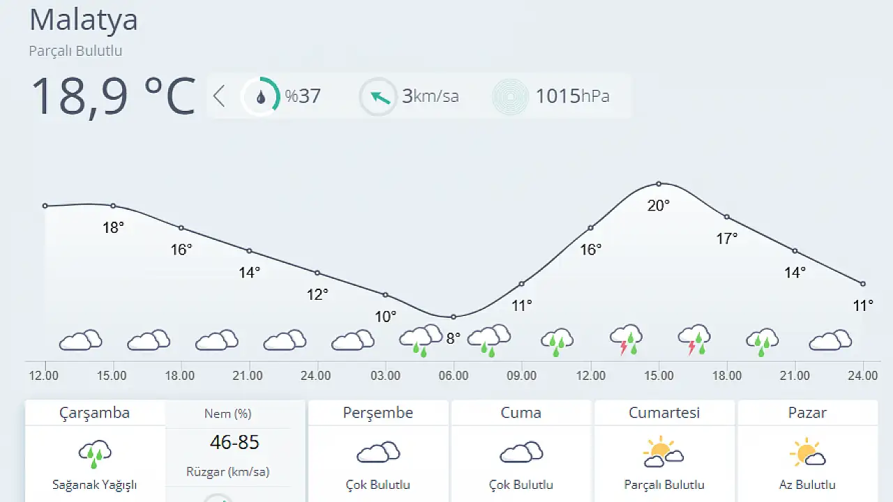 MALATYA (MHA) - Malatya’da gün içerisinde hava parçalı bulutlu geçerken, sıcaklık 18.9 derece olarak ölçüldü. Meteoroloji verilerine göre, akşam saatlerinden itibaren kent genelinde sağanak yağış bekleniyor.