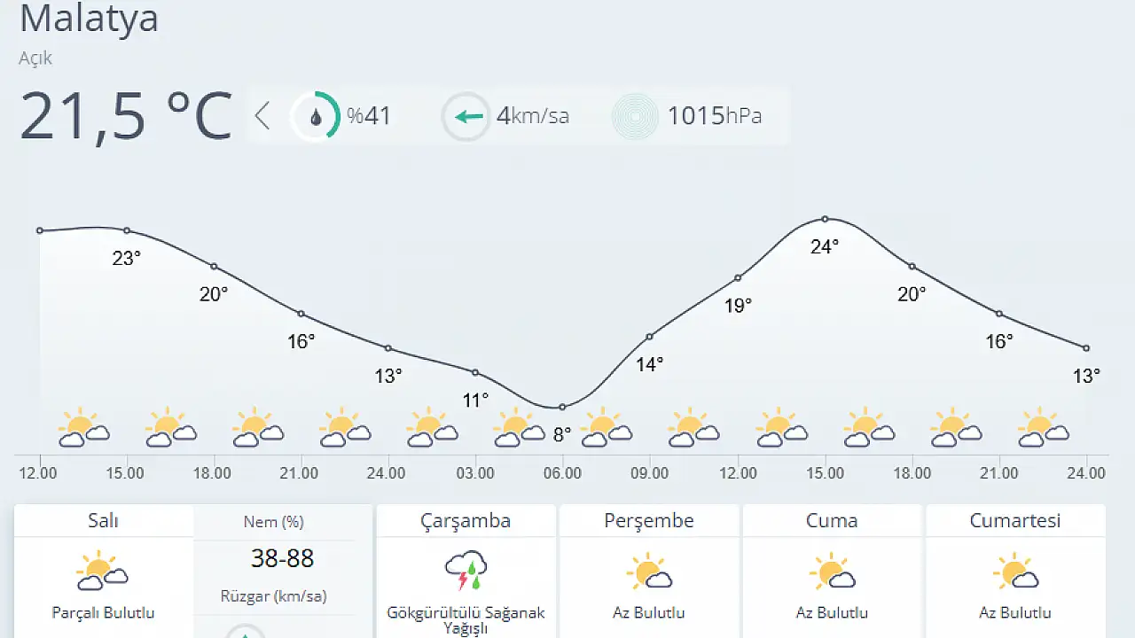 MALATYA (MHA) - Malatya’da hafta başı itibariyle açık ve parçalı bulutlu bir hava etkili olurken, çarşamba günü gök gürültülü sağanak yağış bekleniyor.