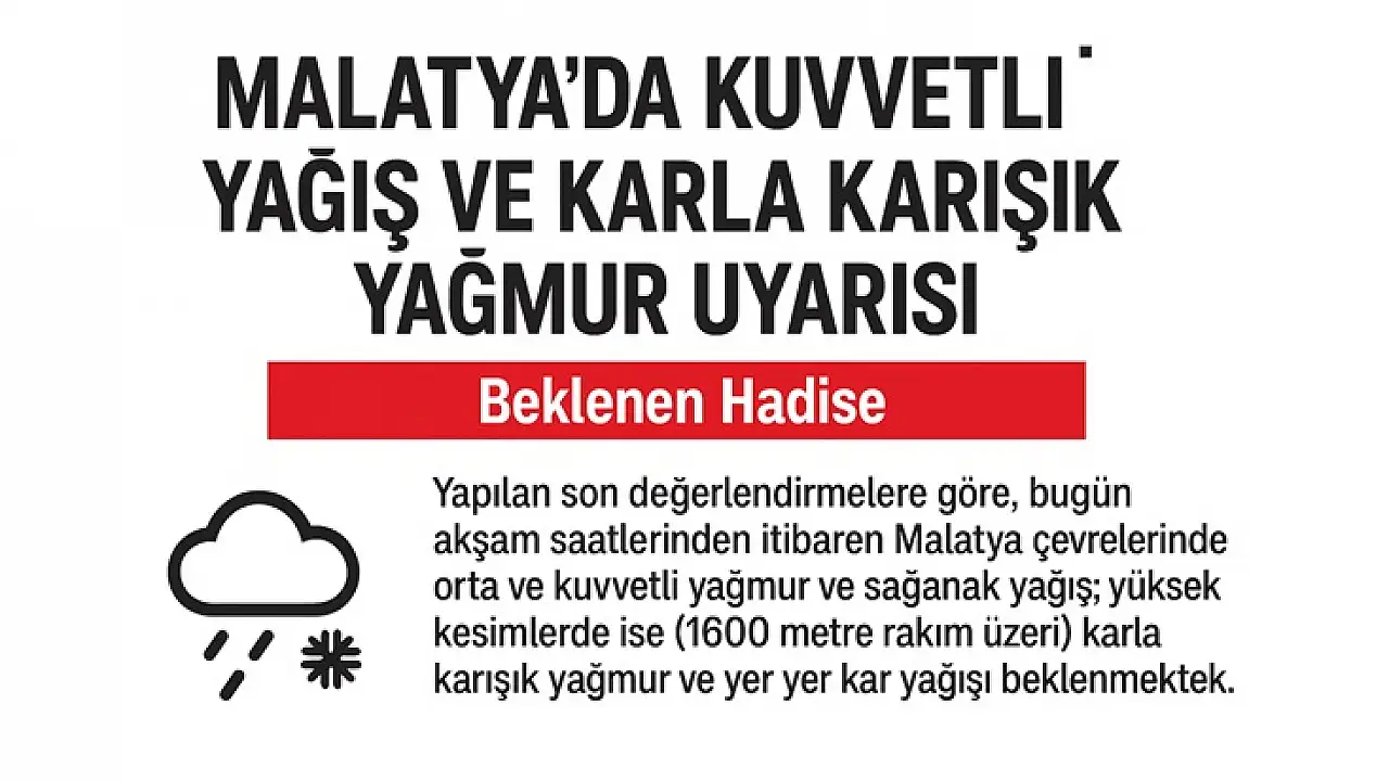 • Malatya'da Kuvvetli Yağış ve Karla Karışık Yağmur Uyarısı