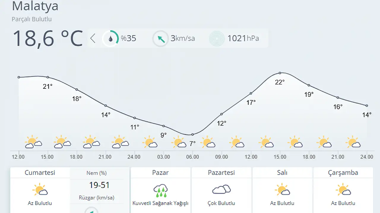 Cumartesi günü hava az bulutlu olacak, sıcaklıklar 7 ila 22 derece arasında değişecek. Ancak pazar günü Malatya’da kuvvetli sağanak yağış bekleniyor. Yağışlarla birlikte hava sıcaklığının 8 ila 22 derece arasında olması tahmin ediliyor.