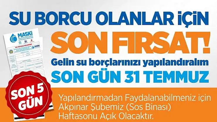7143 Sayılı Kanun kapsamında, vadesi 31 Mart 2018 tarihinden önceki borçların yapılandırma süreci; 30 Mayıs 2018 itibariyle başlamıştı. Başvurular 31 Temmuz 2018 Salı günü mesai bitiminde sona erecek. Konuyla ilgili Hazine ve Maliye Bakanı Berat Albayrak: “Hazine ve Maliye Bakanlığı olarak, yeni bir yapılandırma ya da bu kapsamda borç ötelemesi gibi bir değerlendirme orta vadeli projeksiyonlarımızda yer almamaktadır” dedi. Abonelerin bu son fırsattan yararlanmaları için son 5 gün. MASKİ Genel Müdürlüğü, su borçlarını yapılandırmak isteyen vatandaşlar için Akpınar Şubesi’nin (SOS Binası),ödeme yapmak isteyen aboneler içinise Büyükşehir Belediyesi, SOS Hizmet binası ve Çilesiz Durağındaki veznelerinhafta sonu Cumartesi – Pazar günleri saat:16.00’a kadar hizmet vereceğini bildirdi. Yapılandırma işlemleri için vatandaşlar nüfus cüzdanlarıyla Akpınar Şubesi’nin (SOS Binası) giderek başvurularını yapabilirler. Başvurularını gerçekleştiren vatandaşlarımız kendi isteklerine göre borçlarını 6, 9, 12 ve 18 taksitte ödeyebilirler. Vatandaşların peşin ödemelerinde gecikme faizlerinde %90, 2 taksitle ödemelerinde %50 indirim sağlanacaktır.
