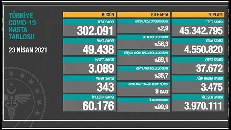 Sağlık Bakanlığı, 23 Nisan 2021 koronavirüs tablosunu açıkladı.