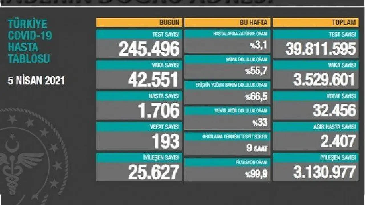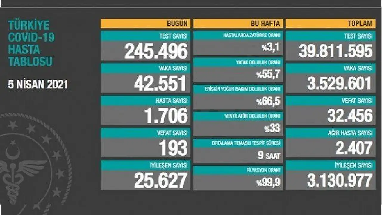 Türkiye'de son 24 saatte 245 bin 496 Kovid-19 testi yapıldı, 42 bin 551 kişinin testi pozitif çıktı, 193 kişi hayatını kaybetti.