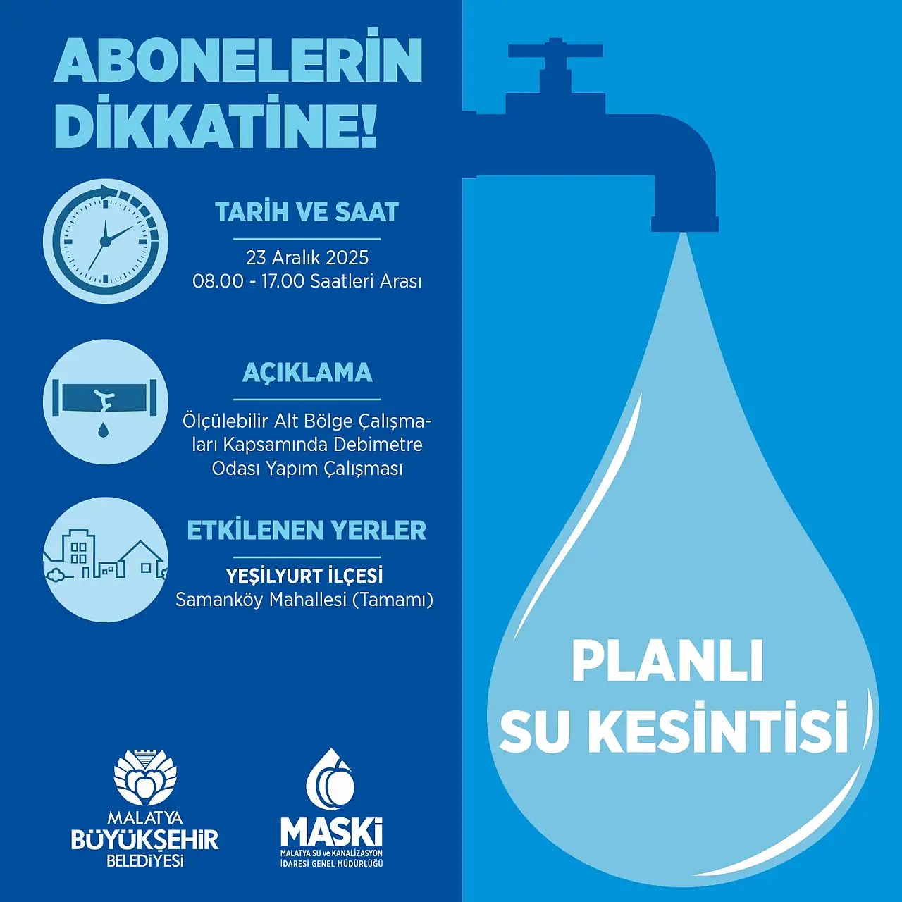 Malatya Büyükşehir Belediyesi MASKİ Genel Müdürlüğü tarafından yürütülen Ölçülebilir Alt Bölge Çalışmaları kapsamında yapılacak debimetre odası yapım çalışması nedeniyle, 23 Aralık 2025 Salı günü 08.00 ile 17.00 saatleri arasında, Yeşilyurt ilçesine bağlı Samanköy Mahallesi’nin tamamında planlı su kesintisi uygulanacak.
