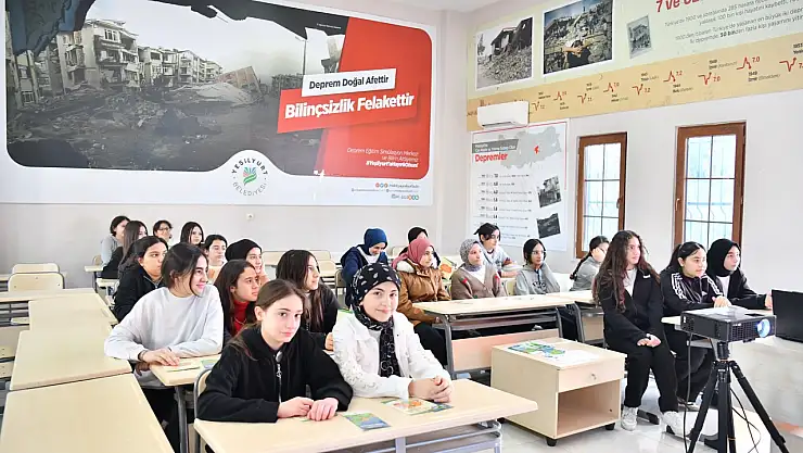 Yeşilyurt Belediyesi, Deprem Eğitim ve Simülasyon Merkezi'nde verdiği eğitimlerle özellikle 6 Şubat depremlerinin yıl dönümünde çocuklar ve gençlerde afet bilincini güçlendirmeyi sürdürüyor.
