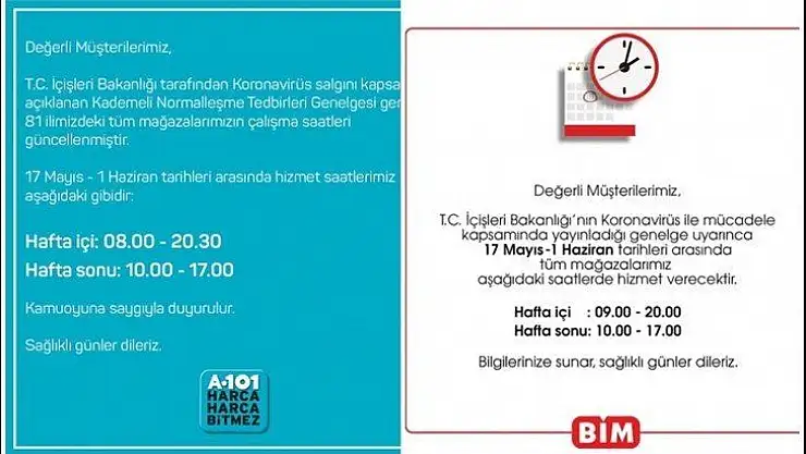 Bundan dolayı A-101 Marketler zinciri 17 Mayıs 1 Haziran tarihleri arasında hizmet saatlerini;